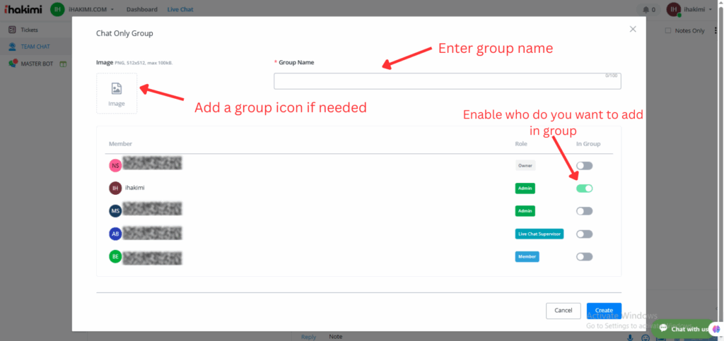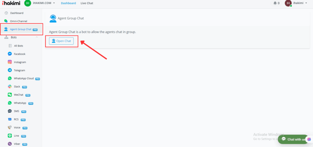 On your ihakimi dashboard, click on the “Agent Group Chat” Tab and then Open Chat to start seeing the channel/groups.