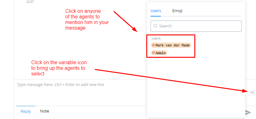 Click on the variable icon and select the agent you want to tag inside the chat from the pop-up menu