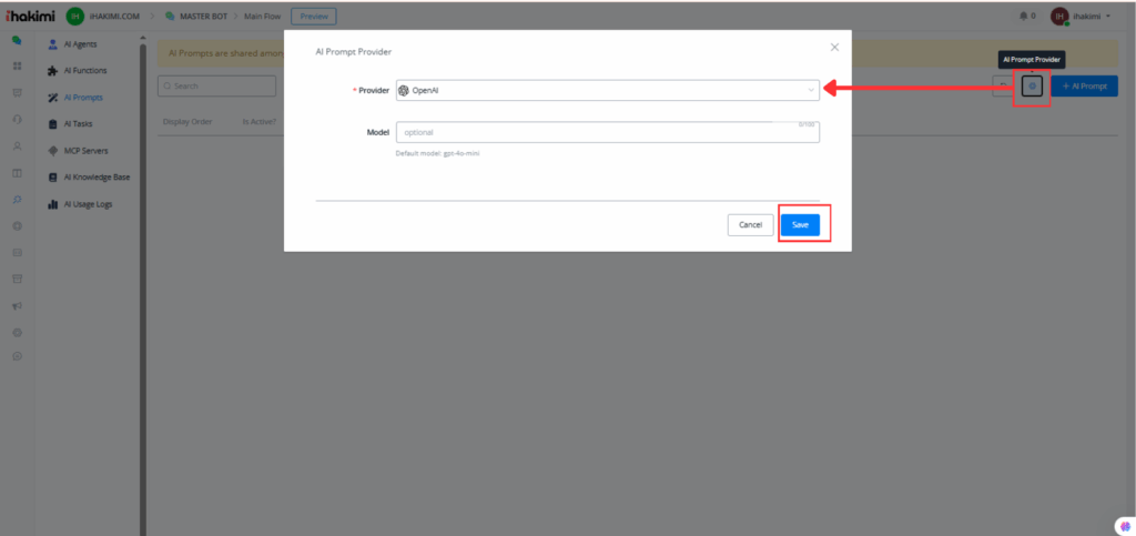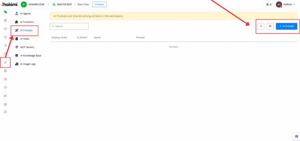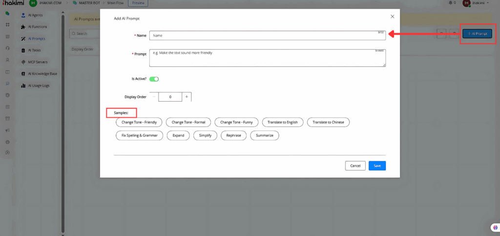 To create a new prompt click the “+ AI Prompt” button. Provide a name for your prompt and enter the prompt content then set the active status and adjust the display order as needed