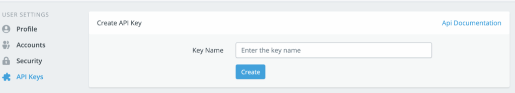 Step 2 Go to the API Keys Section by clicking the button in the User Setting. Enter the key name you would like to set and click the Create button.