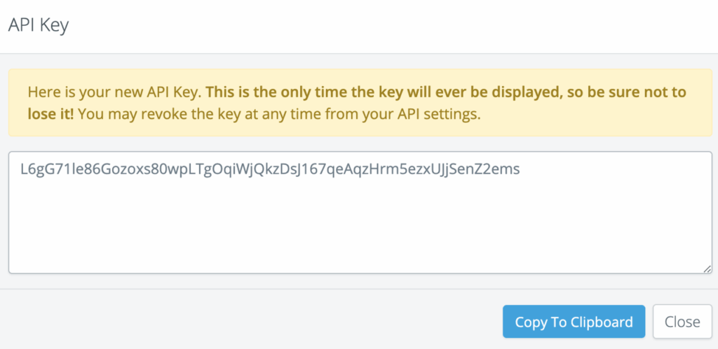 WARNING – Here is your new API Key. This is the only time the key will ever be displayed, so be sure not to lose it! You may revoke the key at any time from your API settings.