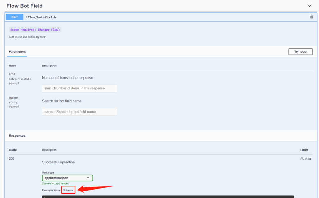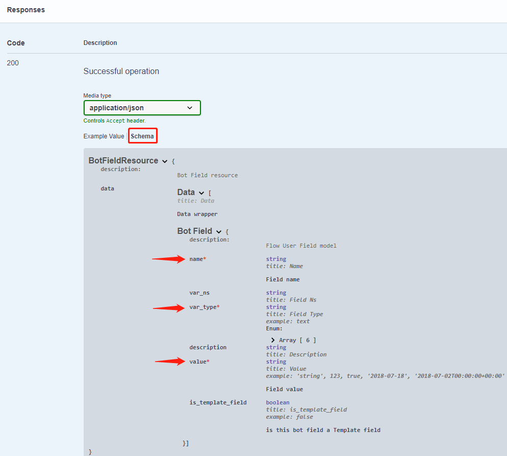 Apart from example value, you can click on “Schema” to view more details like which value is mandatory.