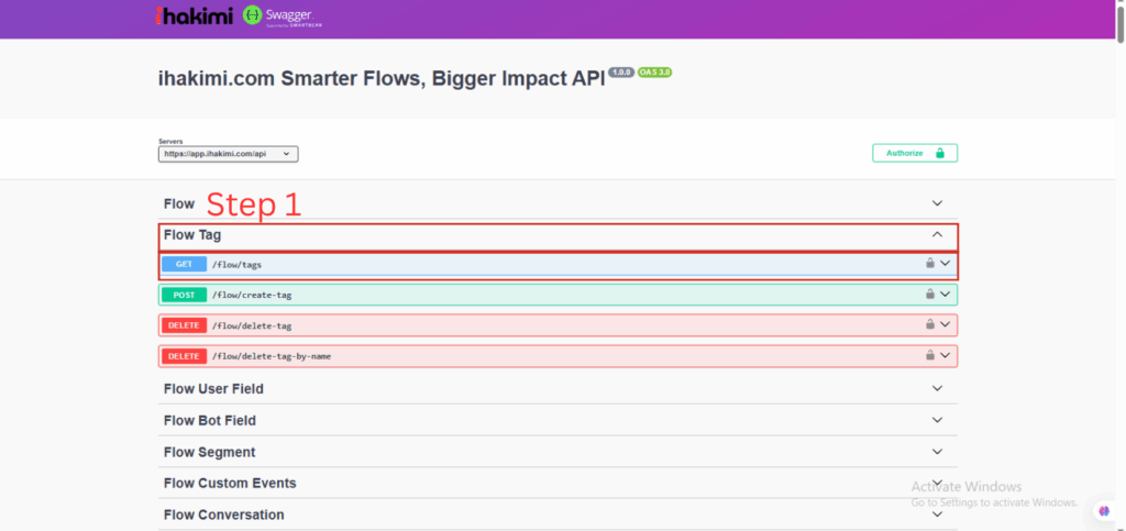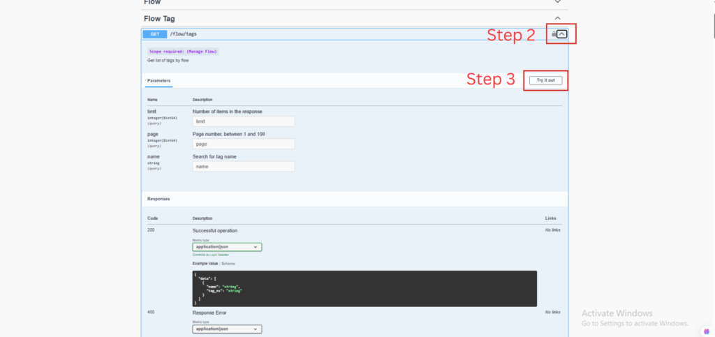 Step 1. Click the expand operation of category, the Flow Tag in this case. Then find the action and the feature, Get /flow/tags. Click the row and a page will dropdown shown as following.