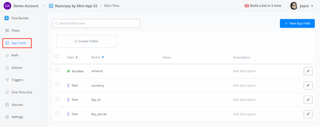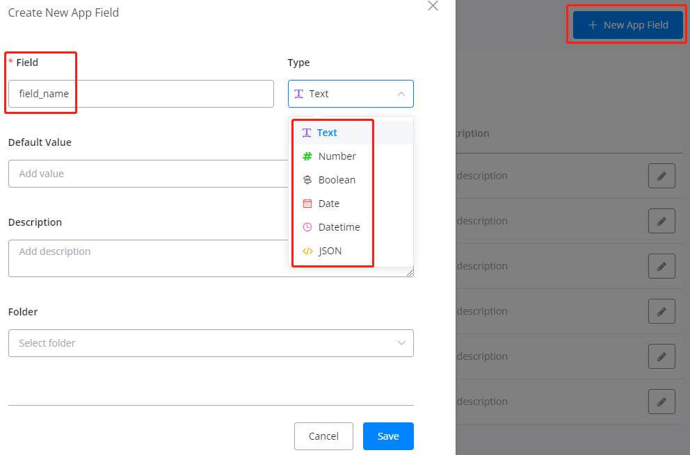 Click on New App Field and give a field name. It’s a good practice to leave no space, but use underscores or hyphen to separate words. Pick a variable type. Add default value or description if needed.