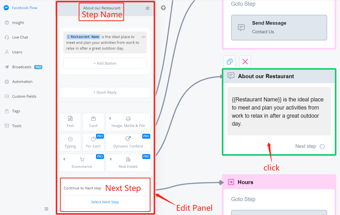 Click on a step to edit it, “Edit Panel” will show next to the sidebar.