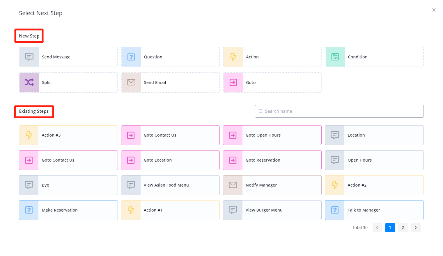 When you choose an existing next step, a line will be connected from the current step to the next. Too many lines can be messy, get a Go to step to help you organize! In a Go to step, you can nominate the next step without creating a line connector.