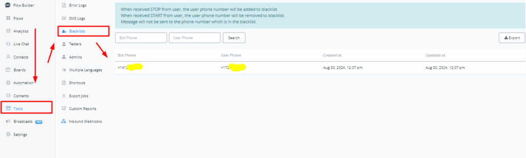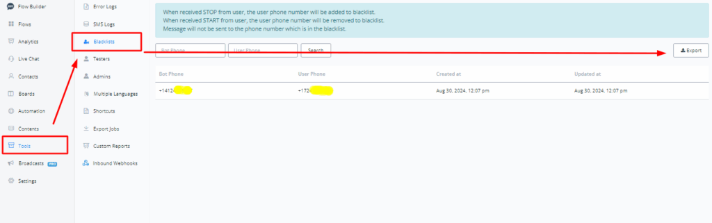If the user texts “STOP” they will automatically be added in the blacklist. If they text “START”, they will be removed from the black list.