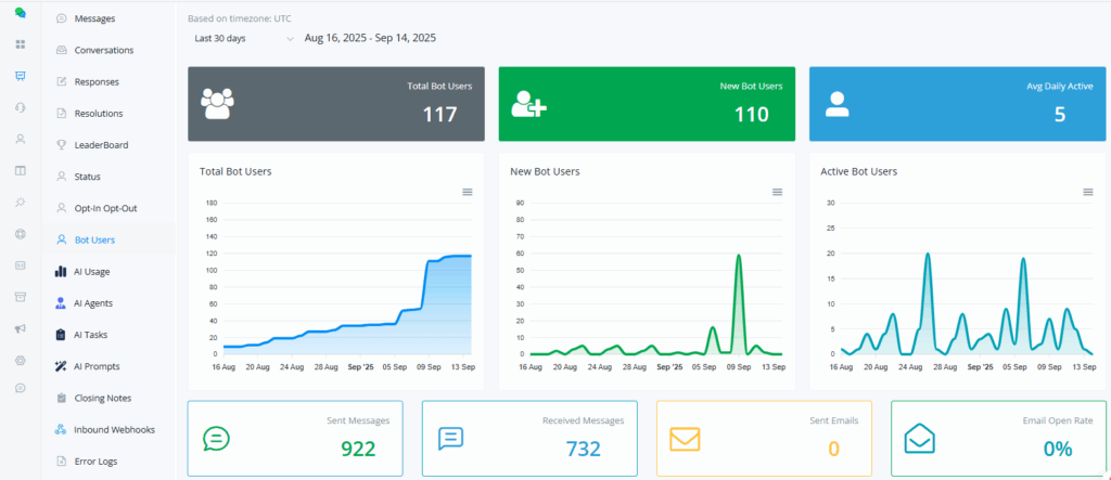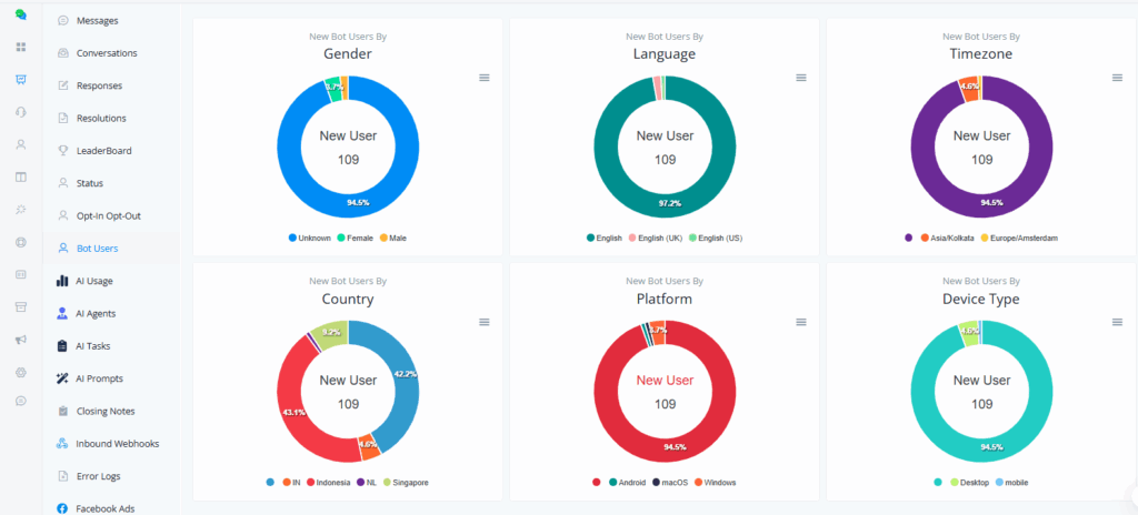 This section provides a comprehensive view of bot usage statistics, including the number of messages sent and received, emails sent, and email open rate. Detailed graphs on new bot users categorized by gender, language, time zone, country, platform, and device type are also provided.
