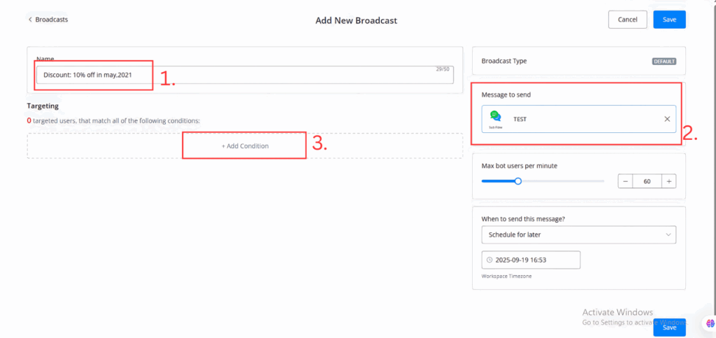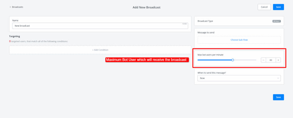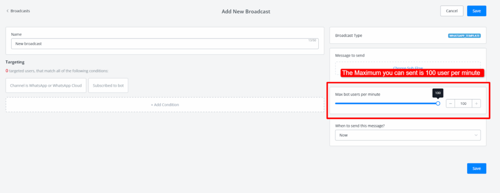 Max Users Per Minute, allows you to adjust the number of users who will receive the broadcast message per minute. This can help in sending messages more gradually, making the broadcast appear more human-like and less automated.