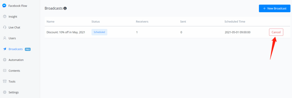 If you choose “Now” for the schedule, the message will be sent once you click “Save”. If not, you can cancel the broadcast anytime before it sent.