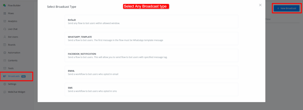 Go “Broadcasts” from the left sidebar, then click “+ New Broadcast”.