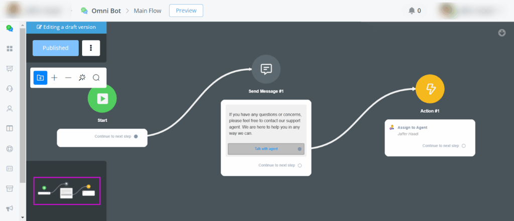 - Start by creating a simple flow where the user is asked if they want to contact support.