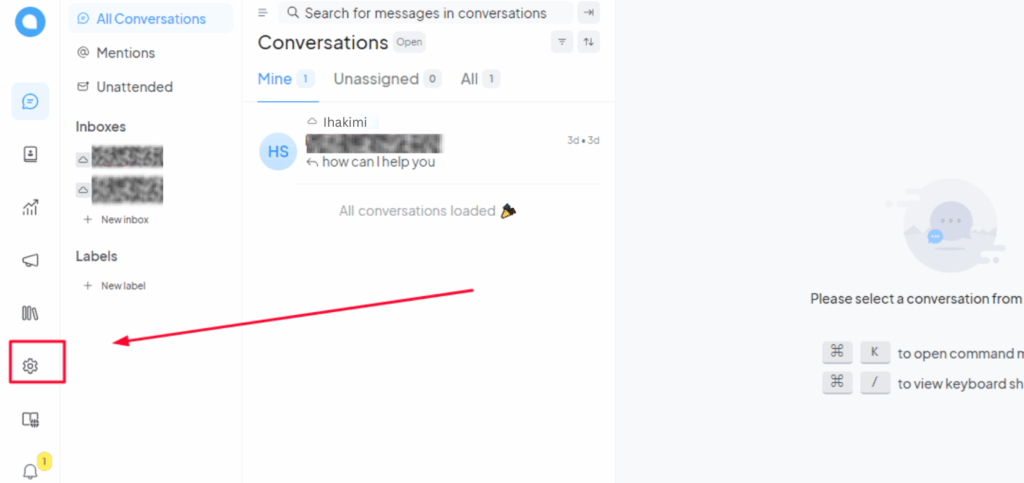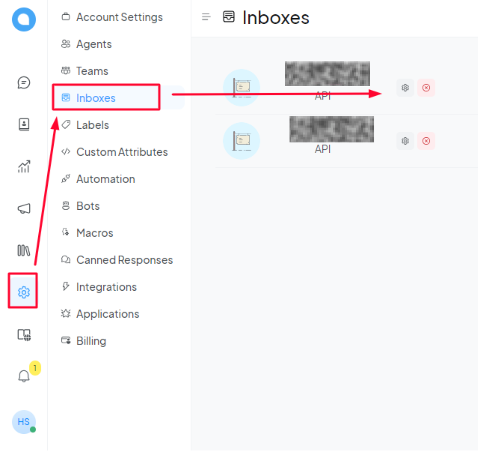 Go to Inboxes tab from the Settings section and click on the gear icon of the inbox you want to integrate with ihakimi.