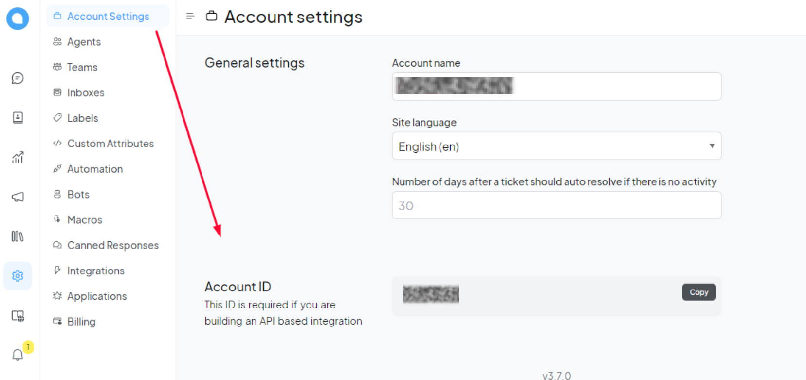 From your chatwoot dashboard, go to your settings tab and into account settings to fetch Account ID