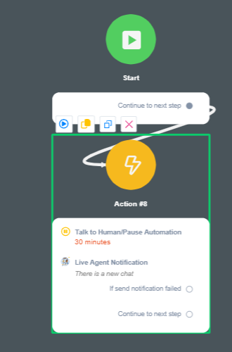 You should be able to use chatwoot livechat once the bot is paused and the agent is notified. The following setup can be used to trigger the transition.