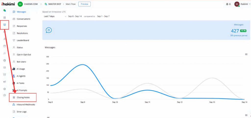 The Closing Notes Report allows you to review the notes left when interactions with users are closed, helping to better understand the context of conversations.