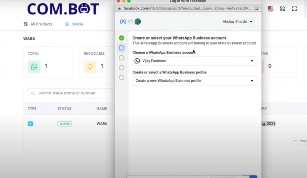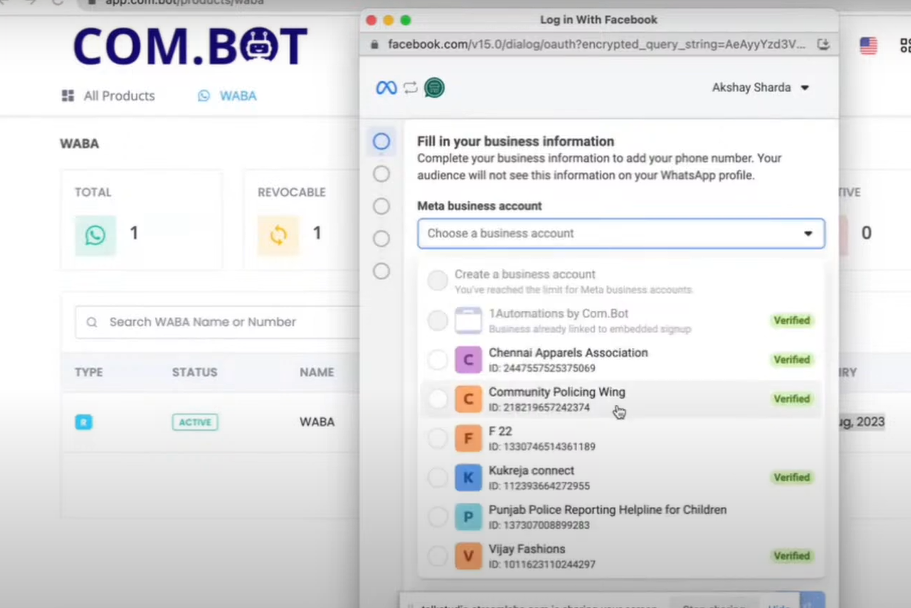 Select the business manager you want to link with Com Bot (If you do not have any, it will give you the option to create one)