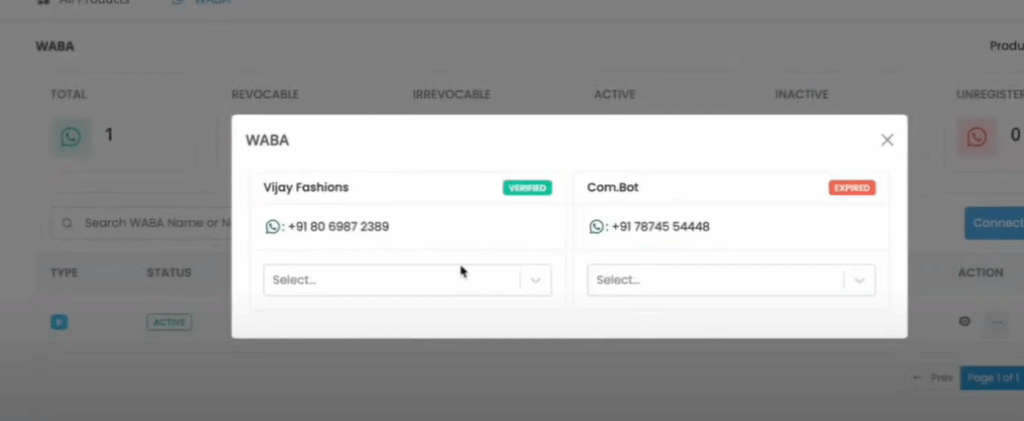 Once connected, you will have the option to attach your number to one of Com bot’s WABA services.