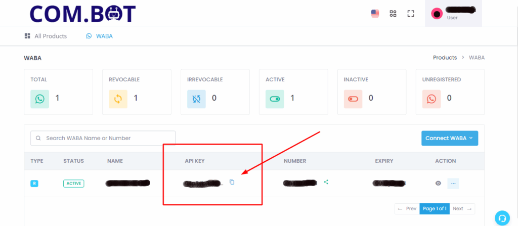 Once your WABA is connected in Com Bot. Click on the copy icon just beside the API Key
