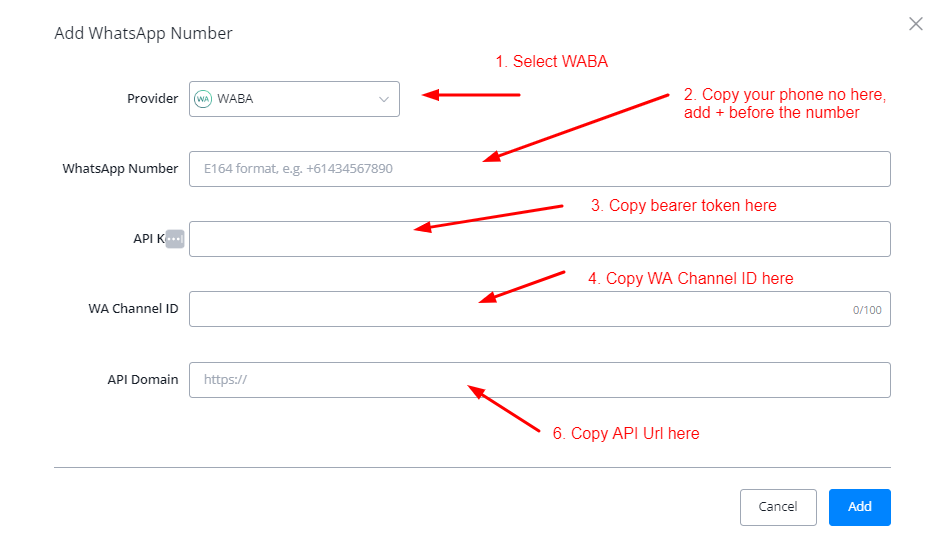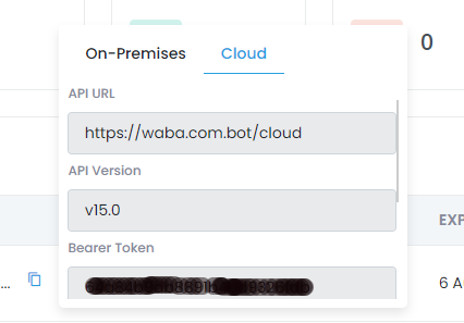 Click on On-Premise, copy the URL as well as the bearer code, and paste it into ihakimi as described above. Under WA Channel ID, copy the bearer token and then click on “Add” to add your number using On-Premise API