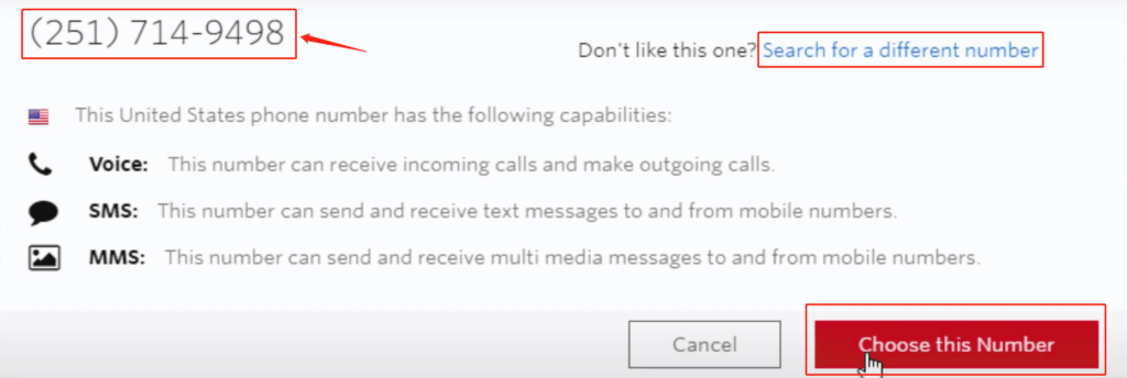 In the pop-up window, the number is shown on the upper left side, click “Choose this Number” or “Search for a different number”. Then you have your own number!
