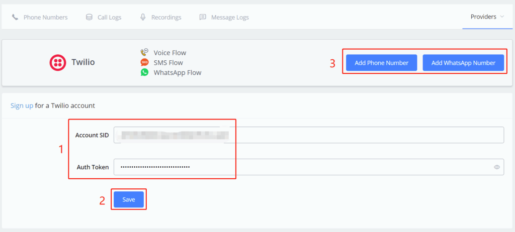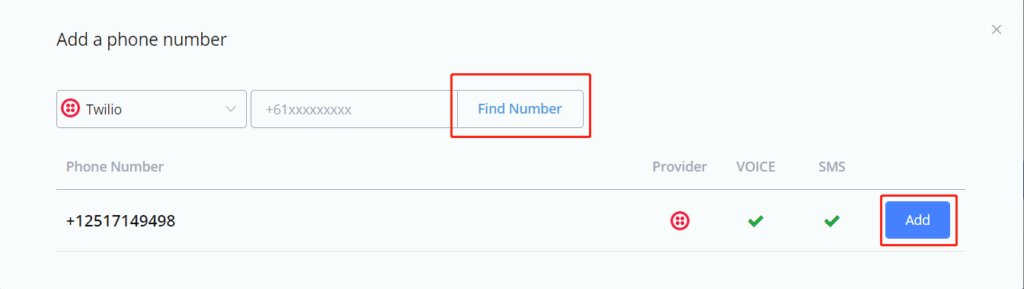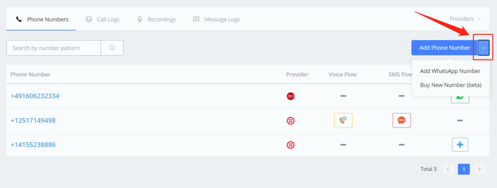 Click “Add Number” in area 3 in the above picture after connecting your provider with ihakimi.