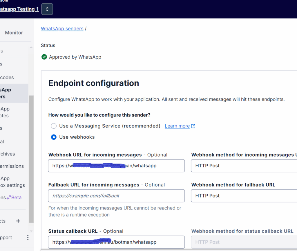 If you are using Twilio for WhatsApp channel as well, then you need to go to WhatsApp senders in Twilio, and then set up below webhook URL.