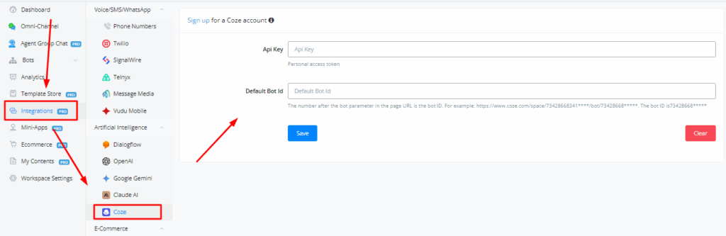 From your dashboard, go to Integrations sections and select “Coze” under the Artificial Intelligence section.