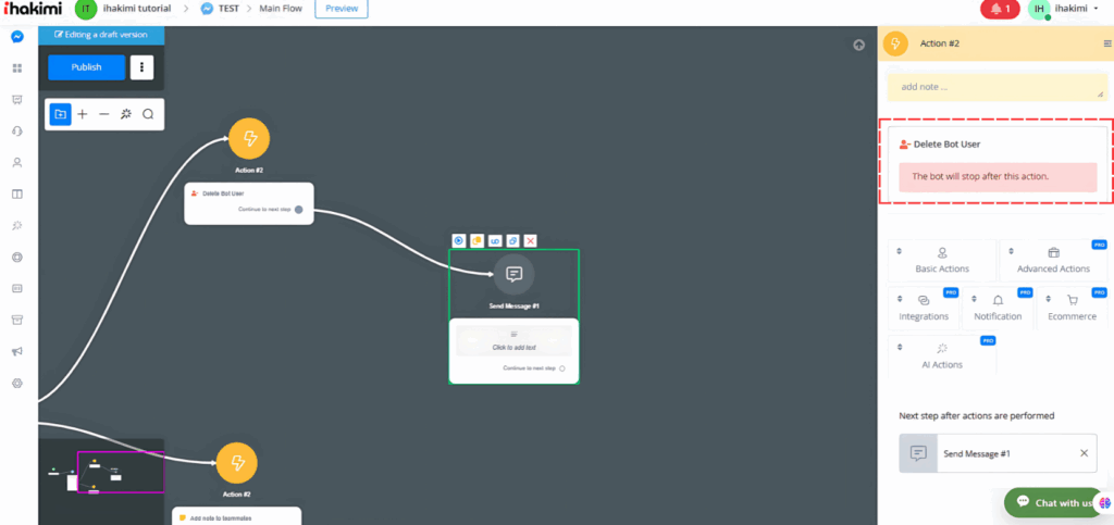 The first method involves using an action step within your chatbot flow. Simply locate the “Delete Bot User” action step under the Basic Actions category. When the flow reaches this step, it will automatically delete the user, ensuring that subsequent messages or conditions are not processed.