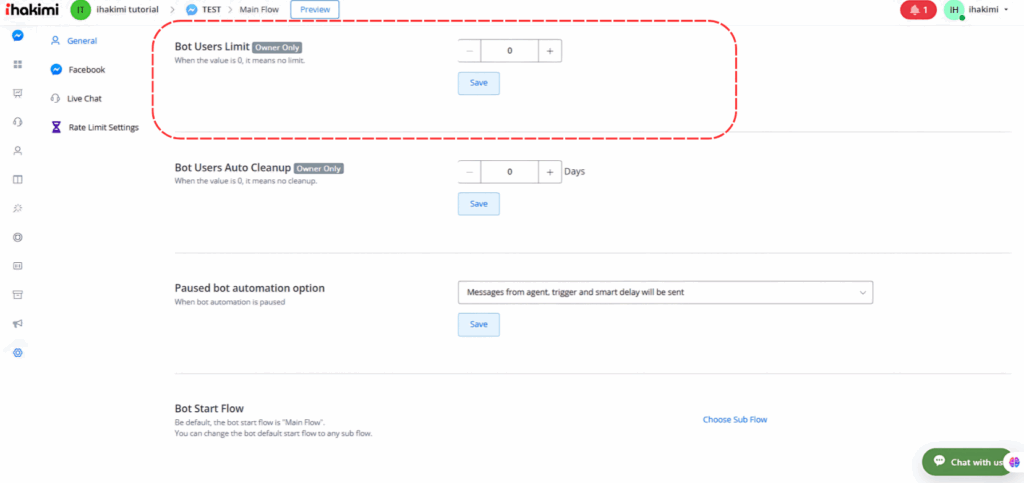 Another way to automatically delete users is by setting bot user limits in the ihakimi settings. Under the General section, you’ll find the “Bot User Limit” option. By specifying a value greater than zero, the system will periodically check the total number of users and delete the oldest users if the limit is exceeded.