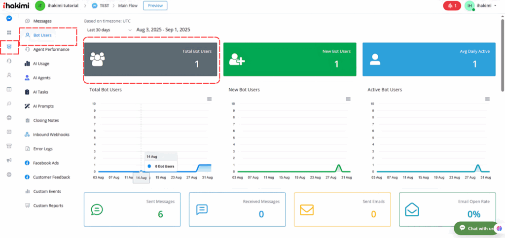 To keep track of the number of users, head over to the Analytics section. Here, you’ll find insights into the total number of bot users. This information will help you determine the appropriate user limit for your chatbot.