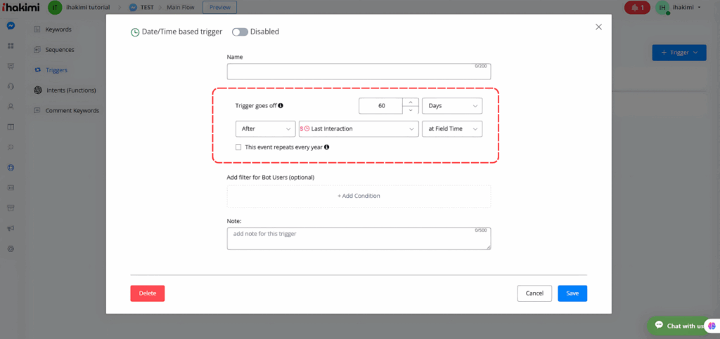 If you prefer a more customized approach, you can create triggers based on specific conditions. For example, you can set a trigger to delete a user if there has been no interaction for a specified period. By using time-based triggers, you have greater control over the deletion process.
