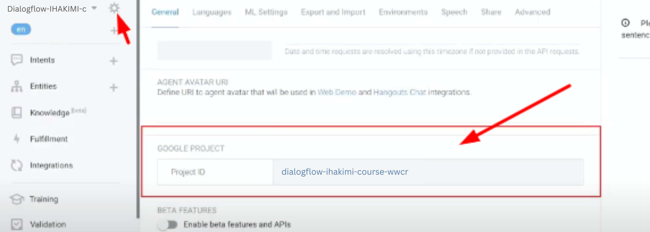 On your dialogflow dashboard, click on the gear icon and then click on your project URL,