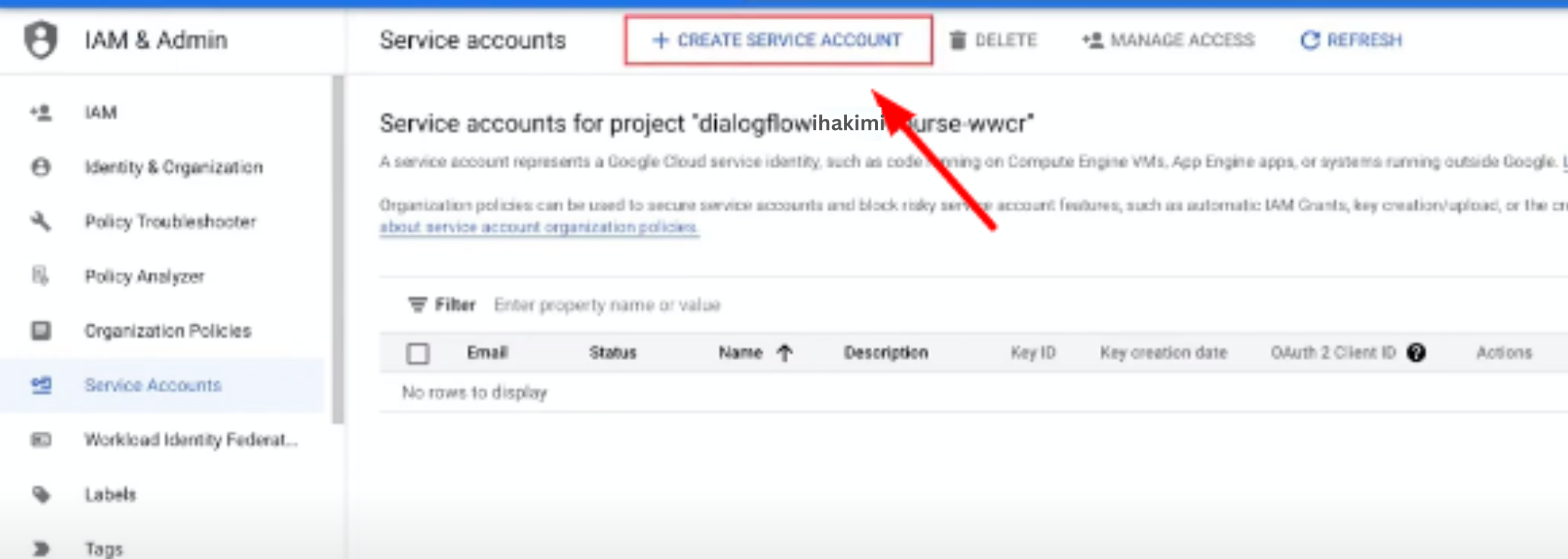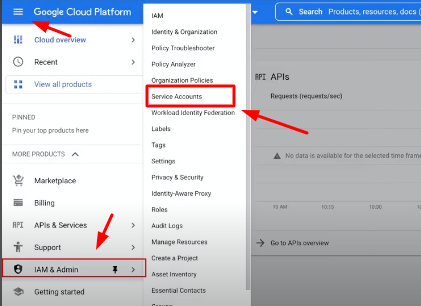 Click on the top-left corner and open the options. Scroll down and click on “IAM & Admin” settings and then to “Service Accounts”