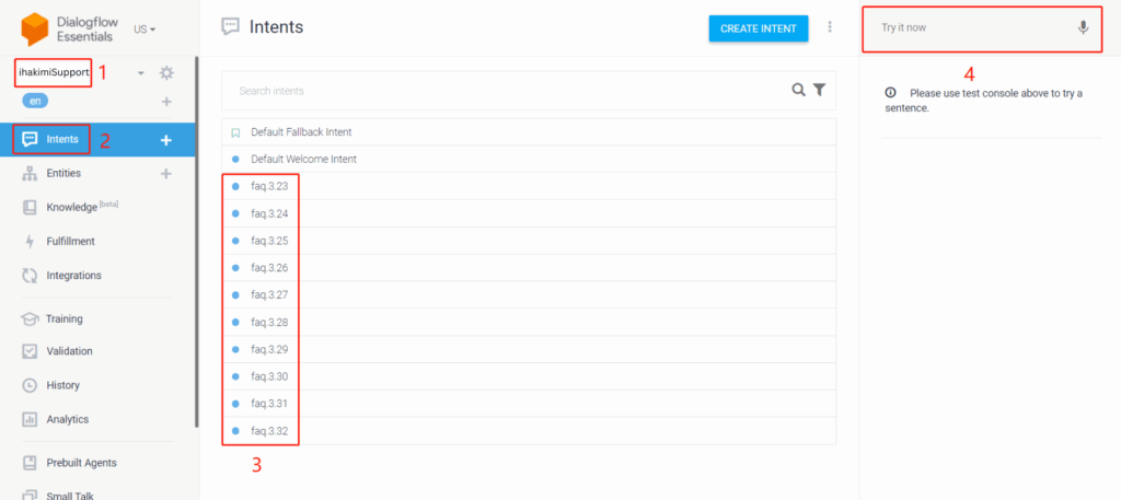 Back to Dialogflow Website, you will see ihakimi created many FAQ intents on behalf of you:
