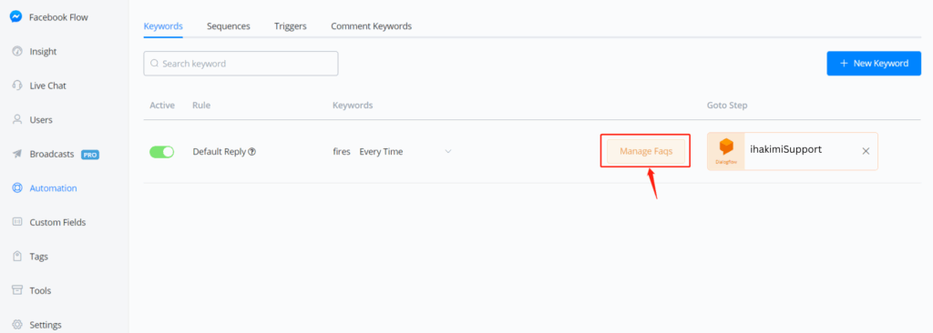 Click “+ New Faq” to start building your smart dialog: