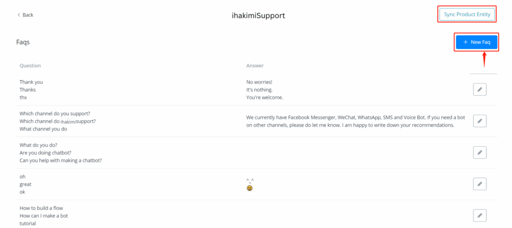 To begin with, create a FAQ in ihakimi with only questions, no answer or sub flow.