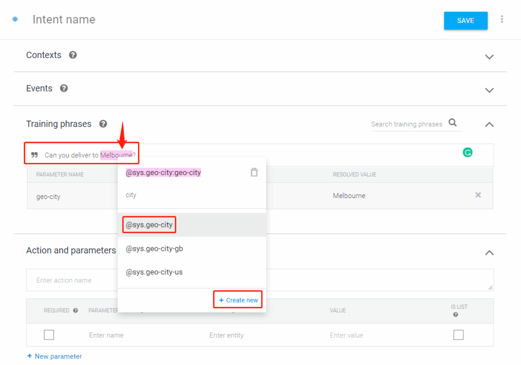For example, in this case, double click to select “Melbourne”, then enter the keyword “city”, click on “@sys-geo-city”. This is telling the bot that the word “Melbourne” is a city. So next time when users asking “Can you deliver to Sydney?” or other cities, the bot can file the question to this FAQ.