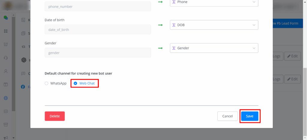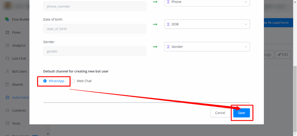 • When you are adding a New form select Default channel for creating a new bot user WhatsApp