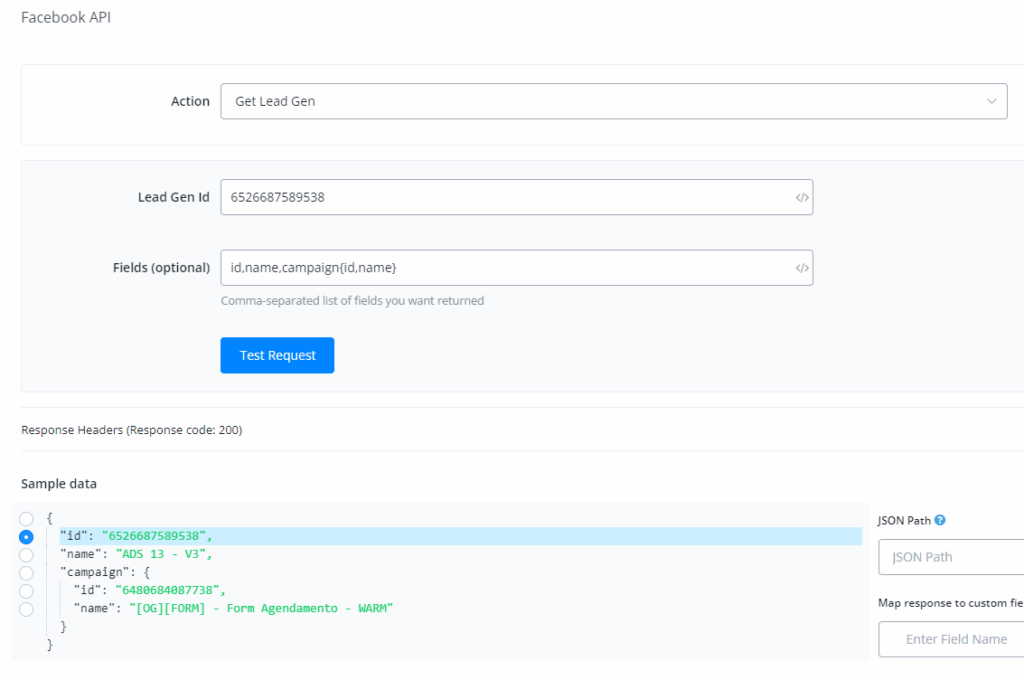 And then you place the ad_id in the lead Gen ID, and then write “id,name,campaign{id,name}” in the fields(optional), you can pull the details adset name & campaign name in the response as per screenshot below.