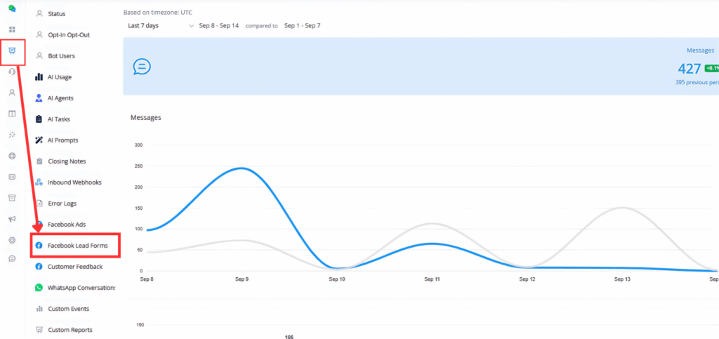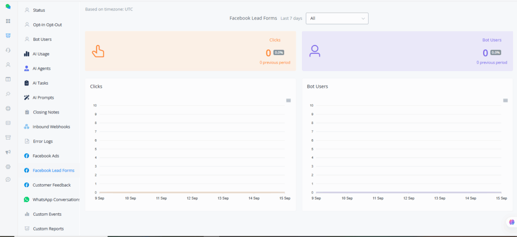 • In the Facebook Lead Forms reports, you can filter the data displayed in the graph by all ads or by a specific ad reference payload, allowing for a more detailed performance analysis.