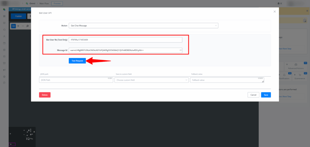 • After testing and successfully mapping the JSON, replace the static Message Id field with a Custom Field that dynamically stores the Message ID.