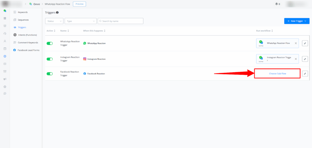 • Select an existing flow: If you already have a flow set up to handle Facebook reactions, simply connect it to the trigger.