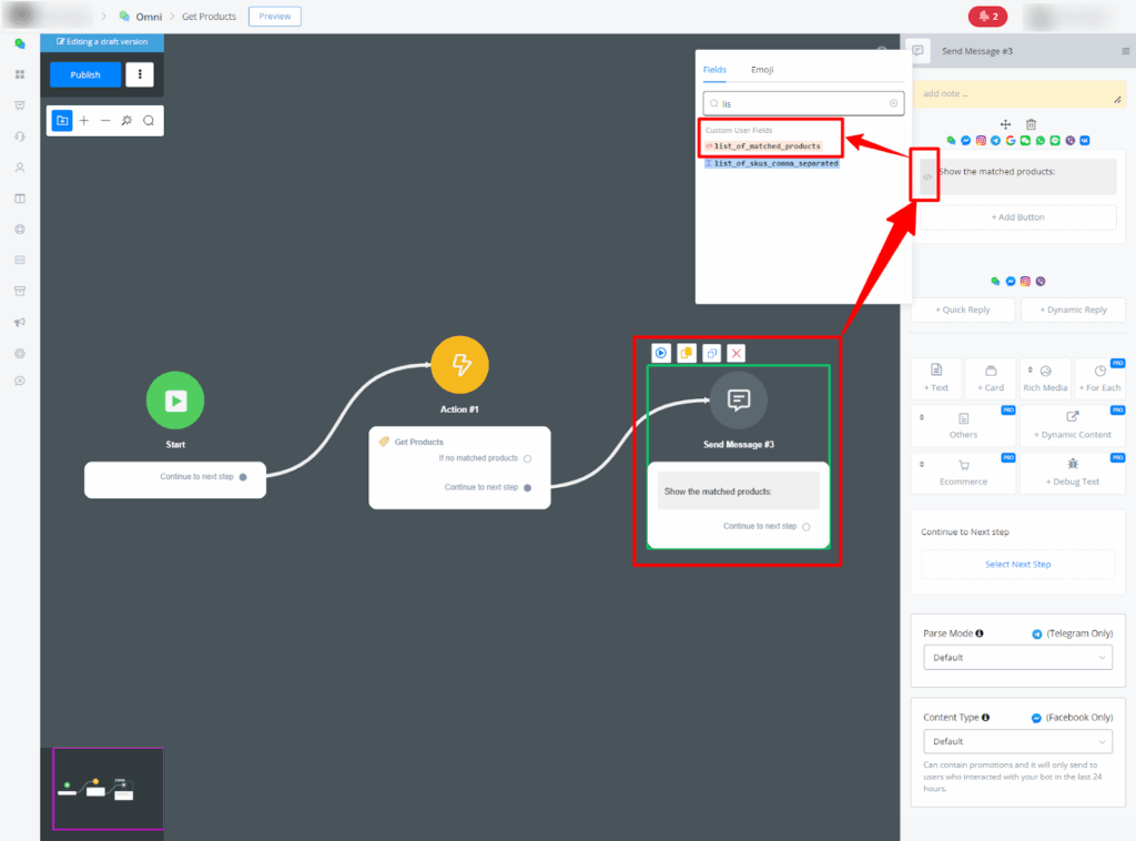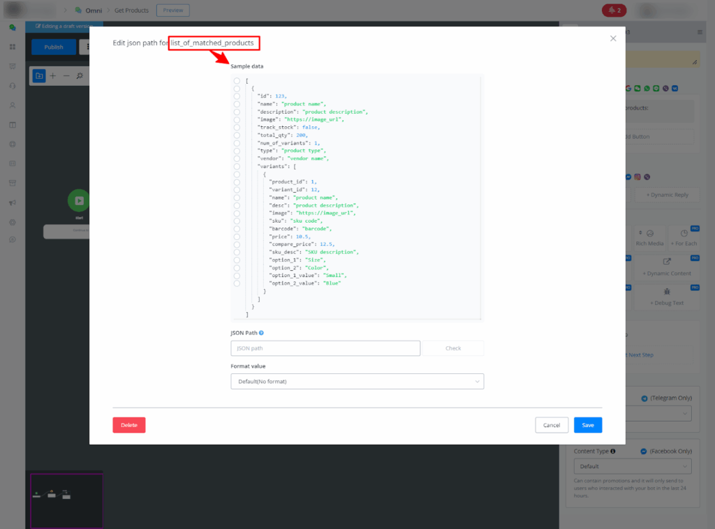 After configuring the parameters, the example JSON for the call will be automatically generated in the custom field you chose. This JSON can be viewed in a message or action node, for example, returning the products according to the defined settings. You can manually select the JSON data you want to work with.