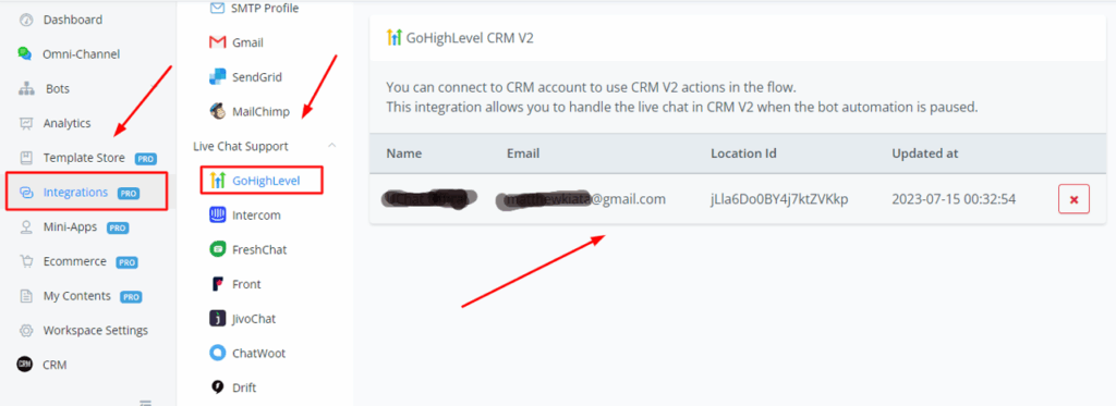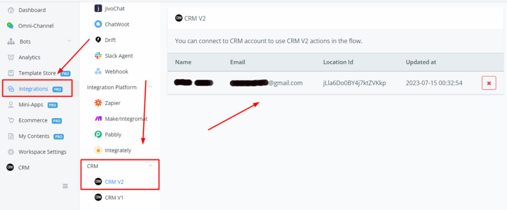 You can also establish a connection by going into the Integrations tab, scrolling till you see the CRM tab, and then connecting your GHL/Airchatty account under CRM V2