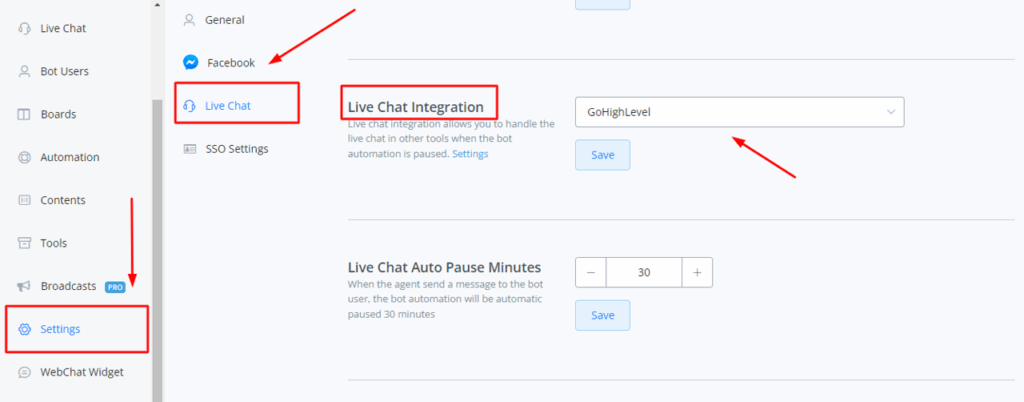 After connecting your account, come inside the bot that you want to connect. Scroll down and select the Settings tab from the side scroll menu. Click on the Live Chat tab. Scroll down till you see “Live Chat Integration” and select “GoHighLevel” from the drop-down menu.