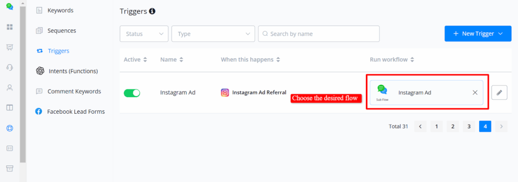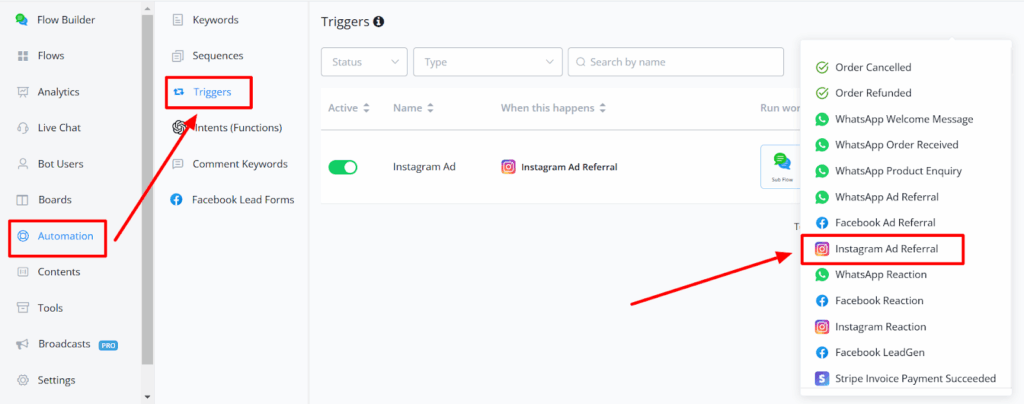 - Set up the trigger and specify the subflow you want to redirect users to. This ensures users land on the appropriate automated journey based on the ad they interacted with.