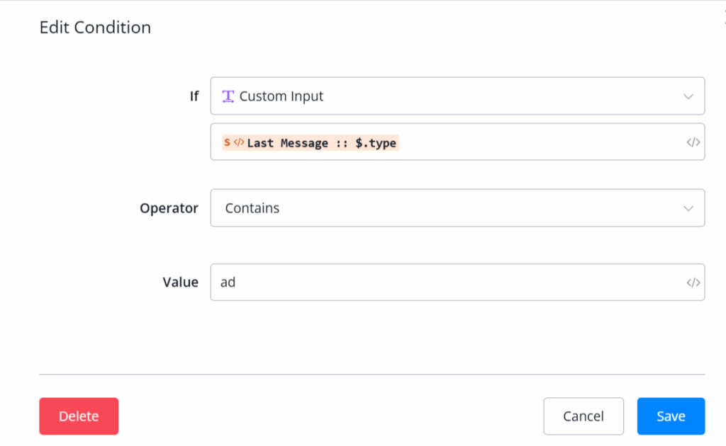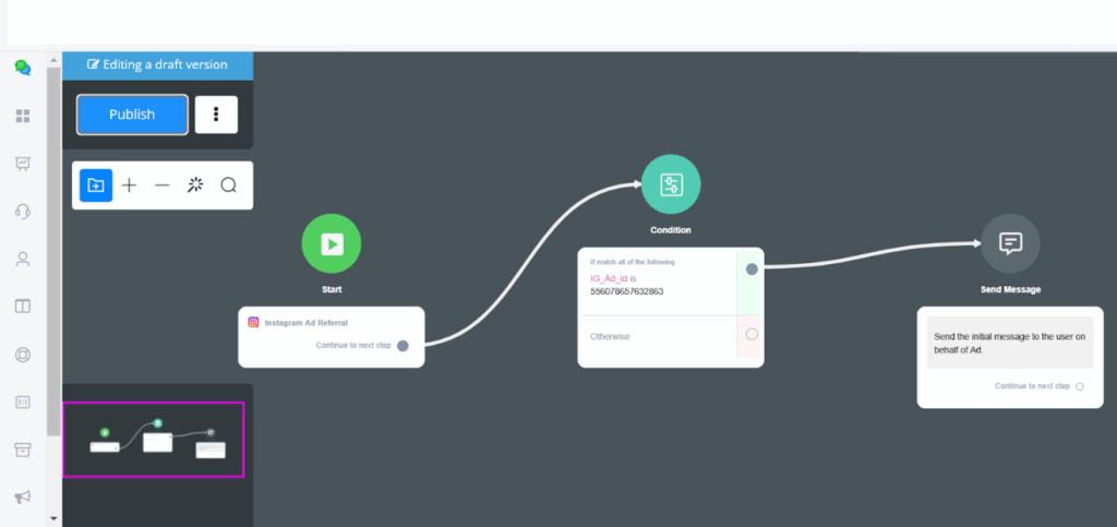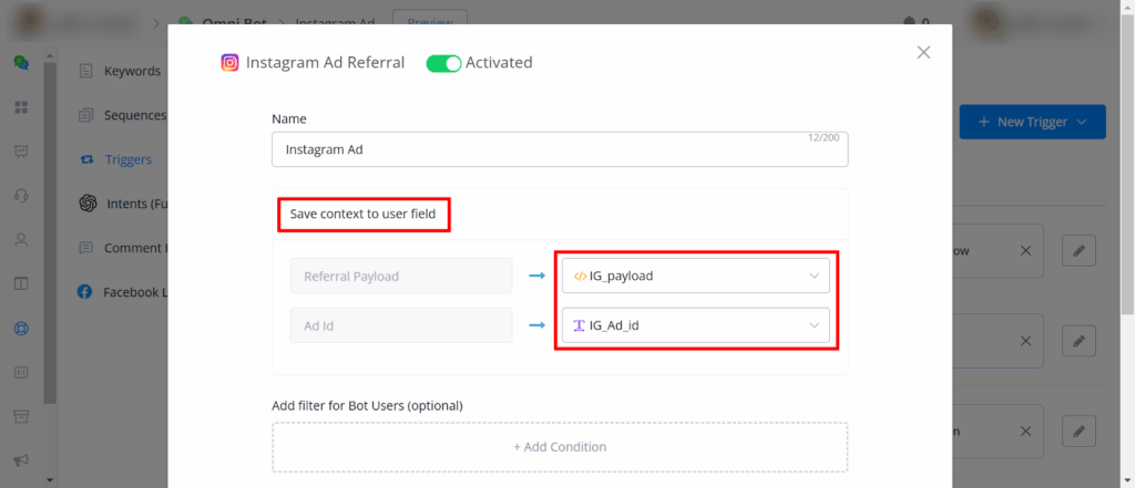 - Configure this node to check the Instagram Ad ID and direct the user to the appropriate flow.