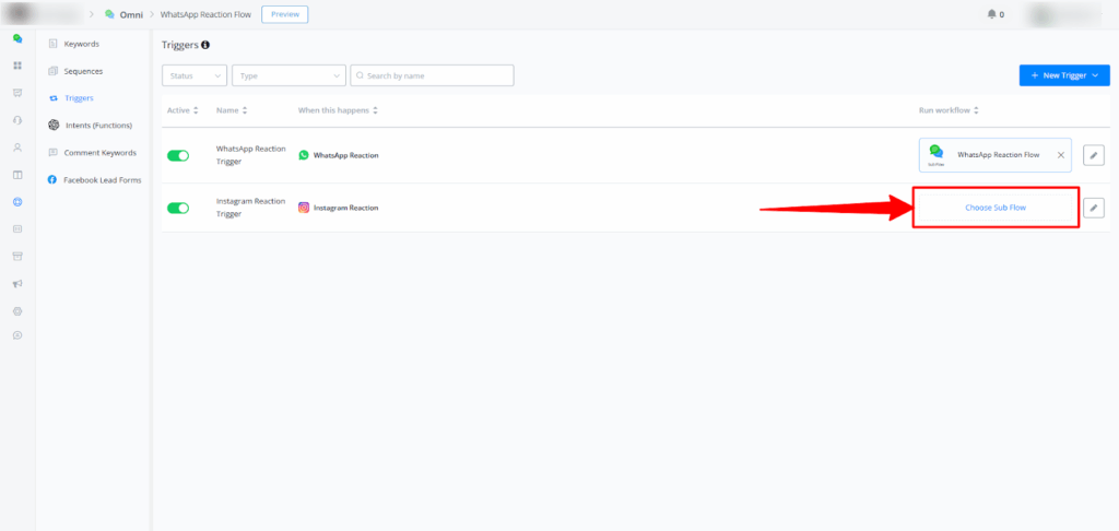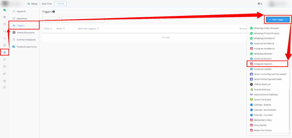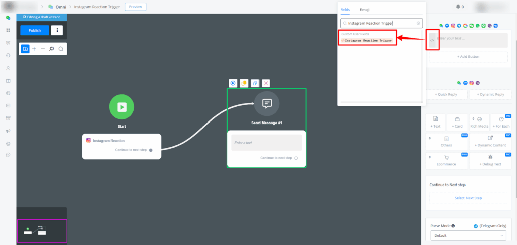 - Select an existing flow: If you already have a flow set up to handle Instagram reactions, simply connect it to the trigger.