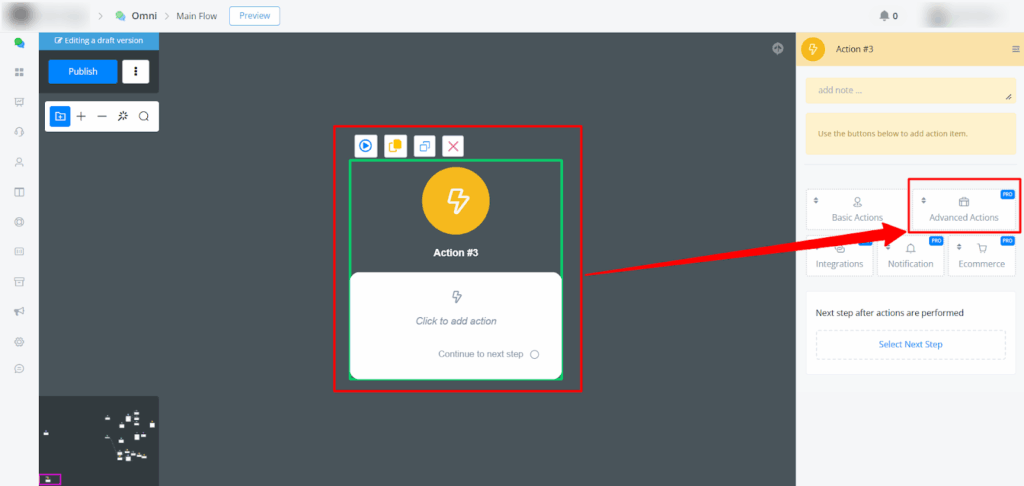 - Drag and drop the Action Node into your flow and go to Advanced Actions.